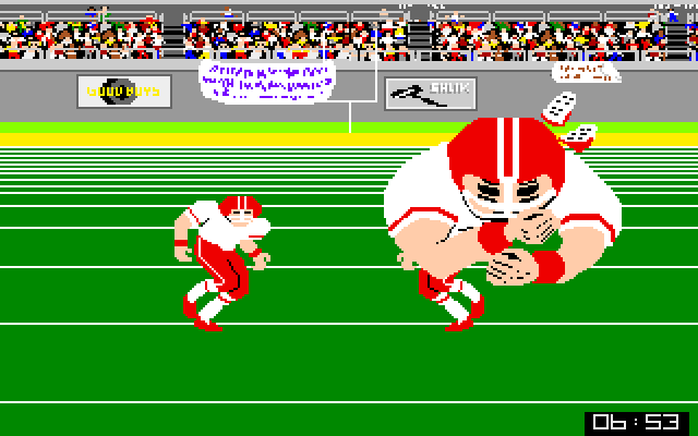 This must be one of the earliest team sport games to use a first-person view – the packaging mocks the Xs and Os used to represent players in contemporary Gridiron games. What you see is what the player sees – control and viewpoint passes from the kicker to the receiver on a punt or kickoff, and the quarterback to the running back or receiver on a pass or kick. Releasing passes involves rotating the controls to select the pass direction. To take the ball, aim the visible hands in the centre of the screen.