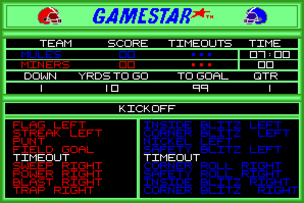 There are 28 teams split into four divisions; their names are fictional (including the Seagulls, Mustangs and Geronimos), and each is rated out of 3 on 8 areas of skill. Matches last for 4 quarters of either 4 or 7 minutes' in-play time. Menus to select plays or teams involve using diagonal movements for selection.