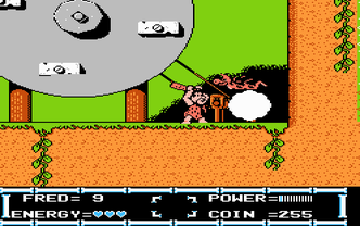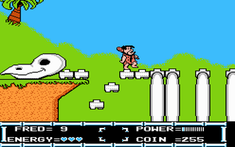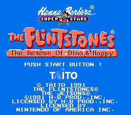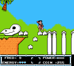 The Flintstones: The Rescue of Dino & Hoppy is a side-scrolling platformer for the NES. In it, you control Fred Flintstone through various locations such as Bedrock, Reef Rock, the Jungle and more as he searches for the missing pieces of Gazoo's time machine. Fred has his trusty club which he can use to attack with, or charge up it's power by holding B for a more deadly attack. Fred can collect coins after defeating enemies, which are used to pay for secondary weapons like slingshots and tomahawks, as well as special abilities such as flying and diving.
