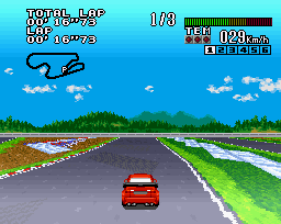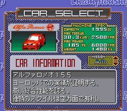 The game provides a Championship mode where the player names their driver and team and takes part in a series of races, as well as standard versus and practice modes. The game makes ample use of Mode 7 for its racecourses.