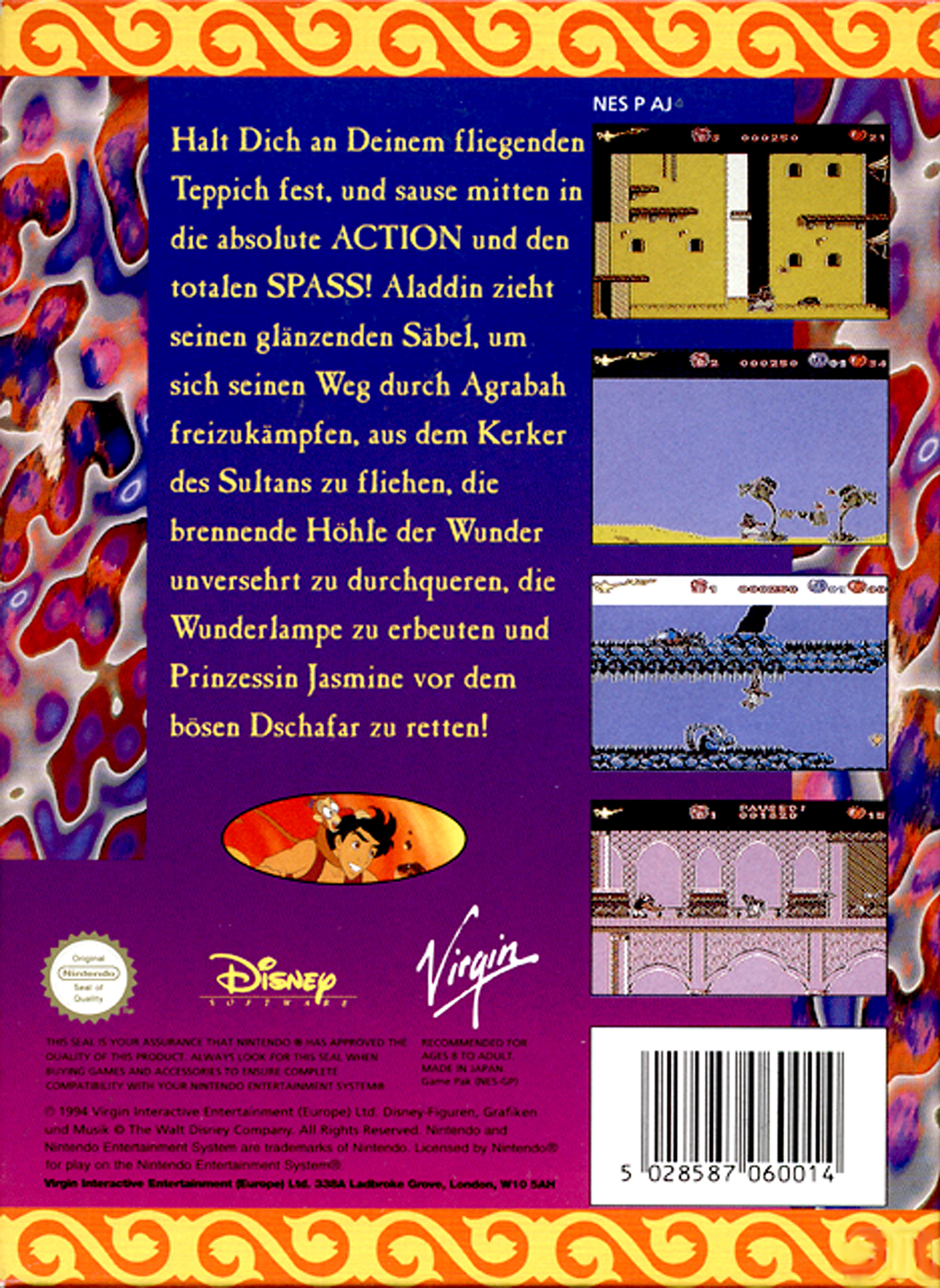 | __long_description | The player controls Aladdin, who must make his way through several levels based on locations from the movie: from the streets and rooftops of Agrabah, the Cave of Wonders and the Sultan's dungeon to the final confrontation in Grand Vizier Jafar's palace. The Sultan's guards and also animals of the desert want to hinder Aladdin in his way. He can defend himself with his sword or by throwing apples. Next to apples, Aladdin can also collect gems which can be traded for lives and continues with a traveling trader. Finding Genie or Abu icons enables bonus rounds. The Genie bonus round is a game of luck played for apples, gems or extra lives. In Abu's bonus round, the player controls the little monkey who has to catch bonus items that fall from the sky, but without touching any of the unwanted objects like rocks and pots.