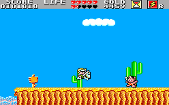 There are twelve locations in which Tom-Tom must venture through, including (but not limited to): the city of Wonder Land, Valley of Peace, The Coastal Town of Baraboro, The Mam Desert, and Pororo Islands. During his journey, he must defeat monsters with the sword that he got at the beginning of his adventure. These monsters will leave either gold coins or bags of cash, which he can use to buy better weapons, shields, armors, and boots. At the end of each location, there is usually a boss that Tom-Tom must defeat in order to obtain a gold key that will unlock the exit gate, as well as plenty of gold coins or bags of cash. If he touches any enemies, or is shot at, he will lose health. During his travels, Tom-Tom must take note of the hourglass; if the hourglass display sands at the bottom, he must get another one that appears out of nowhere, or he'll also lose health. There are two ways in which he can restore it. He can either go into bars to have a drink that will restore it and get a hint about what lies ahead as well, or go into hospitals and heal himself to restore the lost health.