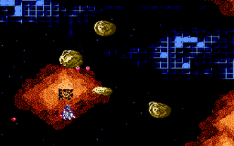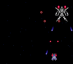 Uchūkeibitai SDF is a vertically scrolling space shooter. Though it scrolls vertically, you are granted some movement horizontal movement as well. The action isn't frantic, but the game is still somewhat difficult due to tight enemy attack waves and the possibility of being shot in the back. For this reason, you should not let enemies pass unscathed, since they may shoot back at you from off-screen. At some points, power up capsules will materialize in space. They will grant you not only greater firepower, but also serve as a reconfigurable armor, which is SDF's main selling point. The armor may be moved from your front to your back, and while it is moved in a large arc, it will destroy any enemies it happens to ram. When fastened to your rear, it will also grant a small speed boost. Learning to use the armor is the key to surviving in this game.