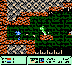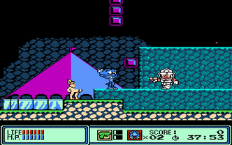 Widget is a game about a perpetually smiling purple alien who must save earth from a gang of alien invaders. The action consists of side scrolling jumping and shooting. However, Widget has the capacity to transform into a variety of other creatures and objects ("widgets") which have application in different situations. These alternate widget forms include a cannon, a mouse, a rock-man, a bird-man, and a dolphin. Transforming uses up magic points which must be replenished. Widget also communicates with a helper named Mega Brain via a wristwatch device.