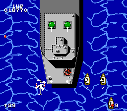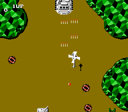 The gameplay is relatively simple: Shots by enemies are one-hit kills. Players have an unlimited supply of missiles that go as far as about half to three quarters of the screen length. They also have two bombs that take out all enemies in a circular area around where the bomb is dropped. These bombs can be shot and destroyed by enemy fire, but the player can replenish them by picking up the green cross power-ups. There are two other cross power-ups that give the player mini-helis that either shoot parallel or perpendicular to the heli's main fire. A red cross gives the player the sideways shooting helis and white crosses shoot straight ahead.