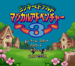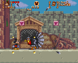 The gameplay starts off much the way previous Magical Quest games have in that you jump on your enemies, spin them around, collect coins, etc. Later both Mickey and Donald will be given costumes that will give them special abilities. You will first receive a set of armor. While Mickey receive a full knight's armor which includes a lance with a giant boxing glove at the end and a shield. Donald, however, gets a barrel and a hammer because his butt's too big for the armor. Both costumes has its pros and cons - for example, Donald's weapon can only be aimed forward while Mickey's can be aimed up/down/forward. But, in water Mickey's armor will drag him down and sink while Donald's can float. If playing with two players, these attributes can be used together so, for example, Mickey can take a ride on Donald's back across the water.