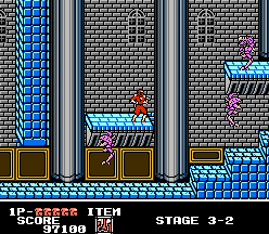 Ninja Crusaders is a side-scrolling action game that can be played alone or with two players fighting side by side. A ninja player can jump quite high and begins the game with a ninja throwing star weapon that can travel the length of the screen, although it's not very powerful. Other weapons are available for the taking throughout the levels, each with considerably less range than the stars but with more power. These weapons include a chain whip, a sword, and a bo staff.