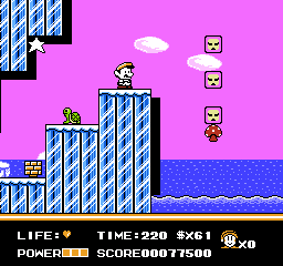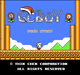 Q Boy (or as the title screen reads, "Q-Boy"), is a platformer game released for the NES by Thin Chen/Sachen. Superficially, it resembles games in the Kirby series due to the character design and powers, but it is significantly different in many ways. Q-Boy has limited ability for his breath/fart, and must wait for the meter to recharge before he can perform any movements of the sort again.