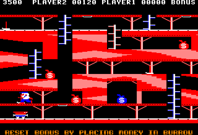 Bagitman is an arcade platformer. The player controls the name-giving Bagitman through several mine shaft levels composed of three screens each, his goal is to pick up money bags and put them into a wheelbarrow at the surface of the mine. Obstacles are pursuing guards, ore carts, and elevators. The only means of defence is a pickaxe, which stuns a guard temporarily. The same happens when the player manages to drop a money bag on top of a guard.