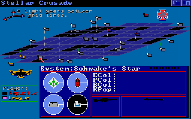Stellar Crusade is a two player game of exploitation and conquest on an interstellar scale. Two rival factions, The League and The People's Holy Republic, compete over a span of decades for control of a small, but richly endowed, star cluster in a remote arm of the galaxy.