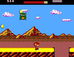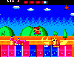 Alex Kidd: The Lost Stars has similar gameplay like in the other Alex Kidd games, but this one's easier and designed for kids. Once again you play Alex, whose mission is to run through each location, knocking down enemies, and obtain the six miracle balls. These balls are hidden inside the strangest places like golden eggs, the Fantasy Zone ship out of action, clamshells, Christmas presents, pumpkins, and desk bells.