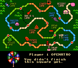 When you land on your spot, if it is just a regular spot, you play an action game for points, upgraded or better weapons, hearts, etc. If the space you land on has a red circle, you spin again. If the space you land on has a red circle connected to another red circle by dashes, you move forward or backwards to the second circle. If the space has a red circle with a question mark in it, you take a pop quiz of three trivia questions then get to select either a key, a heart or move ahead one, two, three or four spaces.
