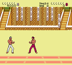 The player takes part in a series of one-on-one karate matches, all overseen by a wise old expert who appears in the background. Once the player defeats an opponent they move up to the next stage and a more difficult adversary. Fights are not won using the energy-bar style found in modern fighting games; instead, the player needed to get two complete yin-yangs. Any move that connected with the opponent would end the round; a loosely timed or borderline kick or punch would obtain half a yin-yang icon, while a well-executed move would obtain a full icon. Two complete icons ended the bout and progressed to the next level.