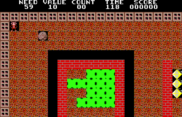 All of the elements and hazards from the previous Boulder Dash outings are back: The fireflies, butterflies, growing amoebas, enchanted walls, and of course, the boulders. New features include titanium (indestructible) walls, growing walls, and slime that allows boulders and diamonds to drop through it at a varying rate.