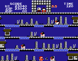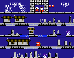 Jajamaru-kun begins on the bottom of a three tiered horizontal field. On each level of this field there are two enemies on each tier. The tiers have weak brick ceilings that Jajamaru-kun can break by jumping into them. Once a passage is made Jajamaru-kun can move through them as can enemies. To clear a level all enemies must be defeated, most enemies can be killed by having a shuriken thrown at them, the only weapon available without a power-up, some need to be stunned either by falling through a hole in a tier or by being jumped on. Enemy projectiles can also be canceled out by the shuriken. Being touched by an enemy projectile, or in a few cases an enemies body, will instantly kill Jajamaru-kun. After an enemy has been killed its spirit will ascend, you can grab this for extra points.
