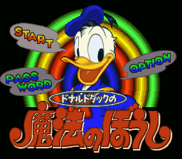Donald Duck no Mahou no Boushi ("Donald Duck's The Magic Hat" or "Donald Duck in The Magic Hat") is a Super Famicom platformer that features the irascible Disney character Donald Duck as he first attempts to raise money to buy the eponymous magic hat for his girlfriend Daisy, and then gets involved in more misadventures due to the headwear.