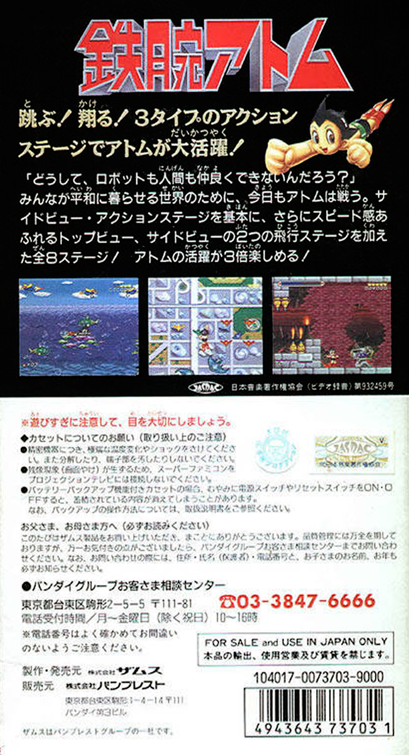 | __long_description | Tetsuwan Atom is an action platforming game developed by Zamuse and published by Banpresto for the Super Famicom (SNES) platform. Tetsuwan Atom was only released in Japan. Tetsuwan Atom is the second video game to feature Astro Boy, the popular manga/anime character. |