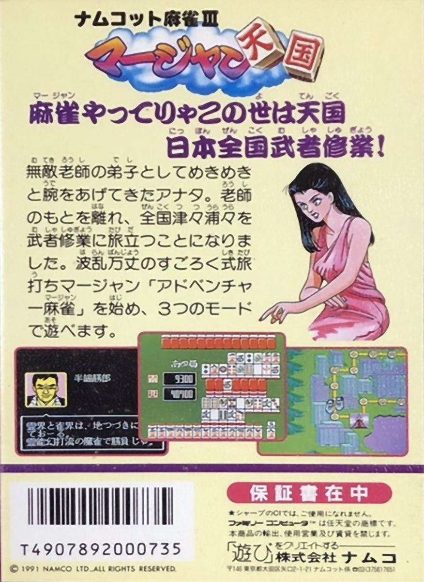 | description | Namcot Mahjong III: Mahjong Tengoku is a mahjong game, developed and published by Namco, which was released in Japan in 1991. |