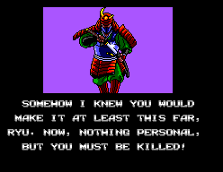 The goal of each level is simply to reach the end of the level before the time runs out. Each level is divided into several sections, and at the end of each level is a boss fight. After beating a boss, a cut scene is shown which continues the story about Ryu's quest for the Bushido scroll and his revenge.