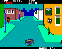 Apart from shooting, Joe can also jump very high, which is often need to reach enemies in higher places. Once in a while a spider will appear, which reflects both your and your foes' shots for some reason. There also pigs appearing frequently, which give away items like a smart bomb when shot. Another odd feature is that hit enemies will shrink and walk off to the lower end of the screen. If they come in contact with Joe, they will cling on to him. This slows him down and constrains his ability to jump, but the enemies will also serve as a bullet shield.