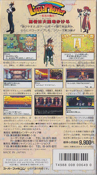 | __long_description | Little Master: Nijiiro no Maseki ("Little Master: Jewels of the Rainbow") is a strategy RPG for the Super Famicom and the third game in the series. The first two games, Little Master Raikubaan no Densetsu and Little Master 2: Kaminari Hikari no Kishi, were exclusive to the Game Boy. Set two years after the events of Little Master 2, the heroes - swordsman Riim, minotaur brawler Mormor and healing mage Tamtam - rescue a goatman from a cave-in, which sets off another series of battles against old foes the Skull Bombers and other villains.