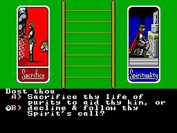 Character creation is done by choosing responses to morally ambiguous questions. Each of the Eight Virtues corresponds to a character class; by determining the player's personal priorities in the virtues, the game assigns a class and a starting location for the Avatar. After emerging in Britannia, the player is free to explore it in various ways (on foot, moongate teleportation, on horseback, by ship, etc.). Certain items must be collected in any order to enter the Stygian Abyss and complete the game. The Avatar also has to reach the highest level in all virtues. This is achieved by various means: donating blood increases Sacrifice, not fleeing from combat increases Valor, etc. The process, however, is not irreversible: should the Avatar overpay a blind seller, he gains Compassion points; should he, on the other hand, cheat the seller by underpaying, his level in several virtues would decrease.