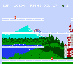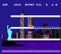 As each stage is traversed, the road behind the car turns white as it is painted, to show where the player has driven. Several obstacles attempt to stop the player's car such as police cars, cats and spike strips. Once all blocks in a level have been painted, the player moves on to the next stage. Random red balloons will appear, if the player grabs three in the same level, it will warp them ahead a few levels and provide bonus points. Even if the player ends up back in New York, the difficulty will stay the same as the previous level warped from.
