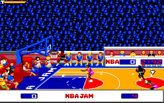 NBA Jam is a two-on-two basketball game You can play any NBA team, and you can play as players like Barkley, Starks, Pippen, and Grant. Each human player controls a single player, so choose your squad wisely to take team-mate skill into account. The game is action-oriented, and players can perform unrealistic slam-dunks. Full performance statistics are automatically recorded. The play clock and 3-point line apply, but other rules are largely overlooked.