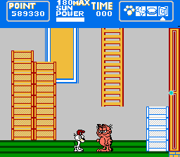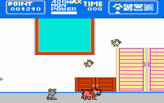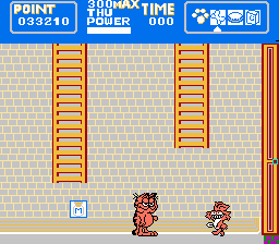 A Week of Garfield is a side-scrolling platform game based on the comic strip by Jim Davis. Garfield heads to the right through various indoor and outdoor city environments, dealing with endless vermin like frogs, birds, and mice using his judo kick skills and several different weapons such as bones that can be thrown. He has a life bar that can quickly deplete if he isn't careful, but hidden all around each stage are various items, which can replenish his health, refill his weapon supplies, and give him super speed or invincibility; be careful, though, as sometimes he'll also find fish bones which will harm Garfield if eaten.