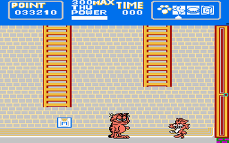 The game is divided into seven stages, each representing a day of the week, and each with several sections. At the end of each section is a door, and Garfield must find the key hidden somewhere on the screen to unlock the door and continue. At the last door of each stage, there is a boss that must be defeated before Garfield can find the key. Each stage also has a strict time limit to keep him from dawdling, and between stages, Jon will appear to encourage Garfield or give him some advice.