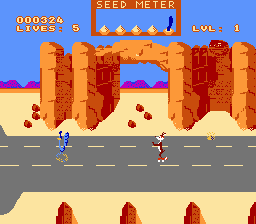Gameplay boils down to eating birdseed while running towards the exit to the west, all the while avoiding Wile E. who will use gadgets like rollerskates or rockets to quickly close the distance. Different gadgets will change Wile E.'s behavior, so the player has to stay alert while also hurrying to the end. Road Runner also has to eat regularly and will run out of steam if the player misses five piles of birdseed in total, allowing Wile E. to easily catch him.