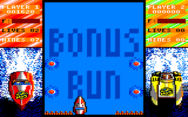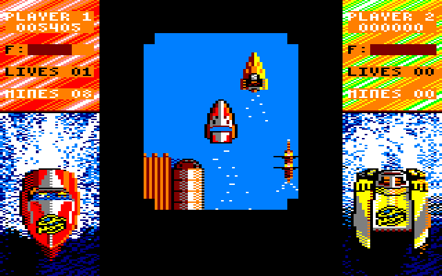 WOW - REAL POWERBOAT RACING! Choose from catamaran or monohull craft - Simultaneous two player action - work as a team or individually. Full throttle - over the jump avoid the helicopters, depth charges, Police boats, hovercraft, whirlpools, BRILLIANT! Ram your mate onto the rocks! Ahhh! Made it! Now it's onto night racing... — Cassette cover