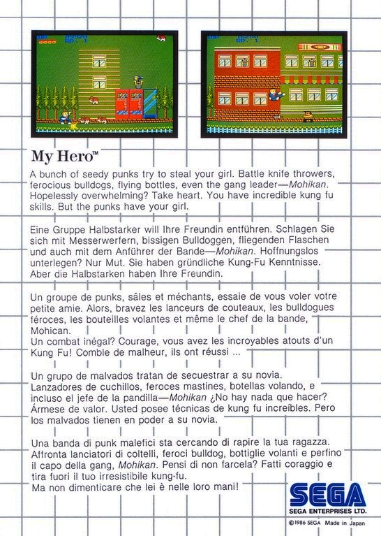 | __long_description | Rescue your girlfriend from the clutches of an evil gang in this extremely unforgiving side-scrolling beat-em-up. The eponymous hero can only jump-kick and punch and must fight numerous thugs, pigs, bulldogs and frogs on his way to the gang's leader, Mohikan. A conversion of this arcade game was released on Master System card format. |
