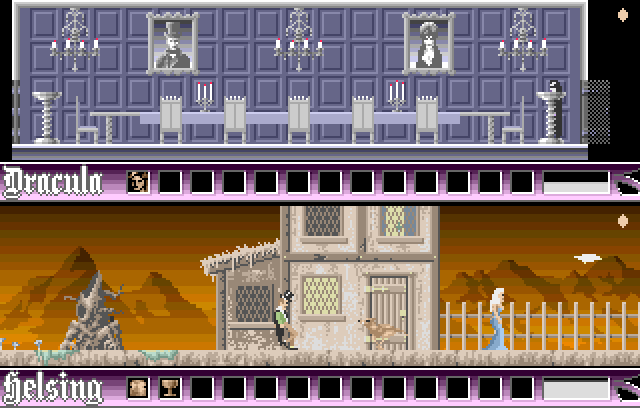 Both characters can be killed by certain hazardous environments and non-player characters (NPCs). Some of these dangers may effect only one of the characters (ghouls only attack Van Helsing, while priests and villagers only harm Dracula). Each player starts with three lives. Collected objects and women are displayed at the bottom of the character window, along with the health bar. The game takes place in the church cemetery and the adjacent village.
