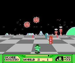 | __long_description | 3-D WorldRunner is a 1987 third-person, action-shooter-platformer, developed by Square. The player assumes the role of Worldrunner, also known as Jack, and must save several planets from strange alien creatures, led by the villian Grax. The game consists of 8 worlds, each divided into separate quadrants. The player must navigate through the level and defeat the endboss before a timer at the bottom of the screen runs out. Worldrunner is not controlled directly by the player, but his movement speed is changed by use of the directional pad. He can also jump and fire missiles, which must be obtained by the player. It was notable for being one of the first pseudo-3D platformers.