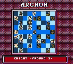 Archon can be played with either one or two players. The NES version, which was released a few years after the other versions, has improved graphics for the real-time combat part. Each type of square has it's own colored background and the unit sprites are larger.