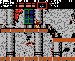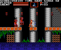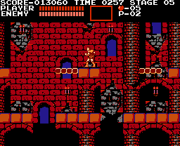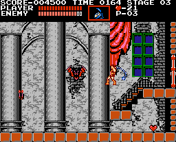 Castlevania is a side-scrolling platform action game. The player takes the role of Simon Belmont, who is able to jump and crack his whip directly in front of him. Power-ups can be obtained by defeating enemies or by whipping candles that appear in the castle. One such power-up increases the power and length of Simon's whip. Different weapons can be gathered which consume hearts when used, these hearts can also be collected from monsters and candles. Additionally, some walls will hide secrets such as the health-restorative turkey or the Double and Triple shot abilities for the weapons Simon has collected. At the end of each section of the castle is a boss, which must be defeated. Progression through the castle eventually leads to a confrontation with Count Dracula himself.