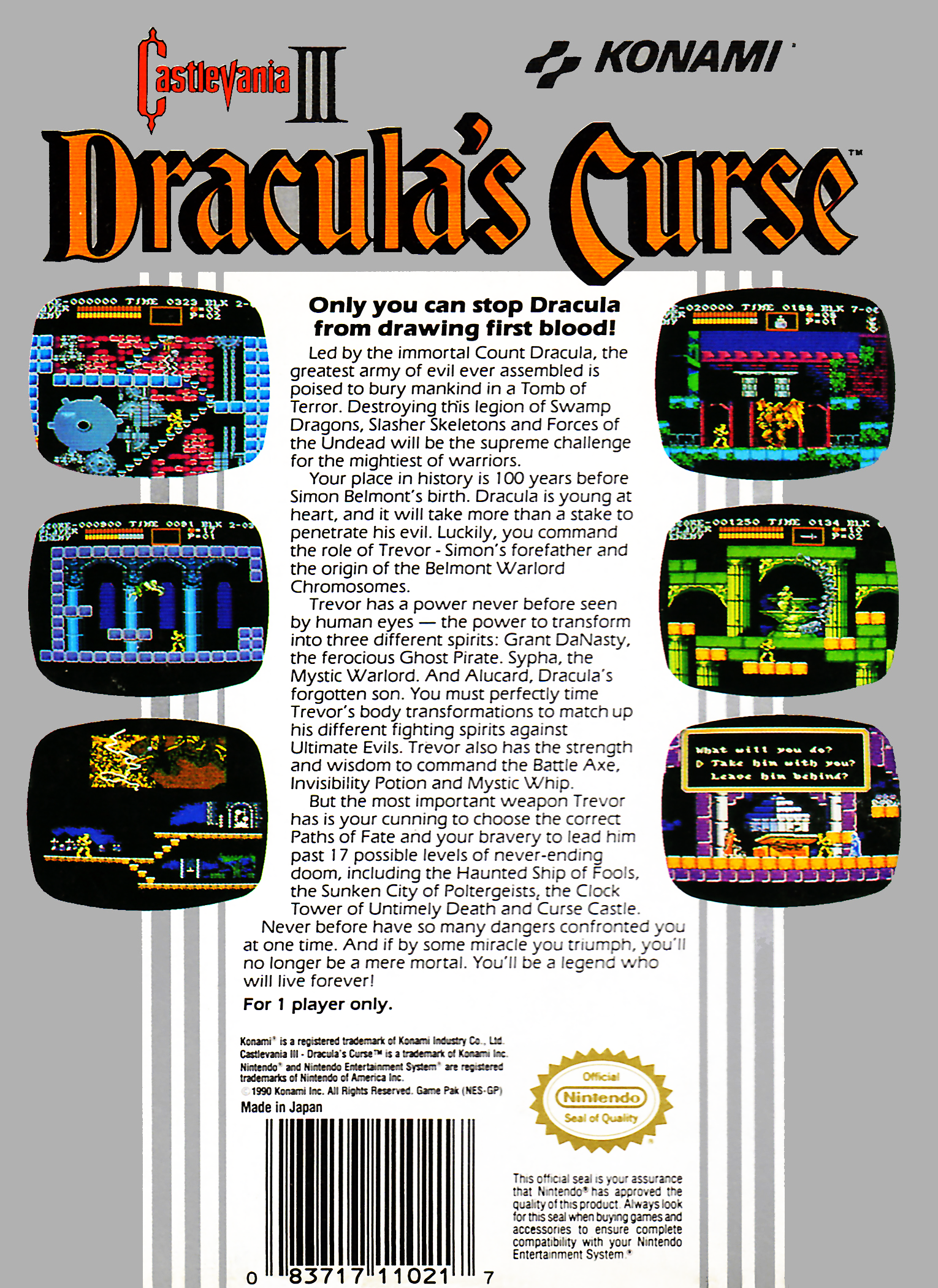 | description | Set over 200 years before the original game, the third installment of the Castlevania series tells the tale of Simon Belmont's ancestor Trevor, who seeks to destroy Dracula with the help of one of three possible companions. |