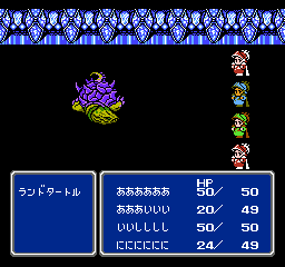 Before the game begins, you give names to the four boys, which look the same (only in different colors) and belong all to the same class - the scrawny Onion Kid. Very quickly, however, you're able to give your heroes "jobs" - proper character classes, such as Fighter, Black Mage, Viking, Shaman and others. Each job has different capabilities and can use different equipment. More powerful jobs become available later in the game. The characters can change jobs throughout the game, though it costs them "Capacity Points" (which are earned in battle).