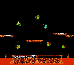 In Joust, players take control of a knight with a lance who rides their flying ostrich (or stork, for Player 2) to do battle against computer-controlled evil knights who ride atop vultures.