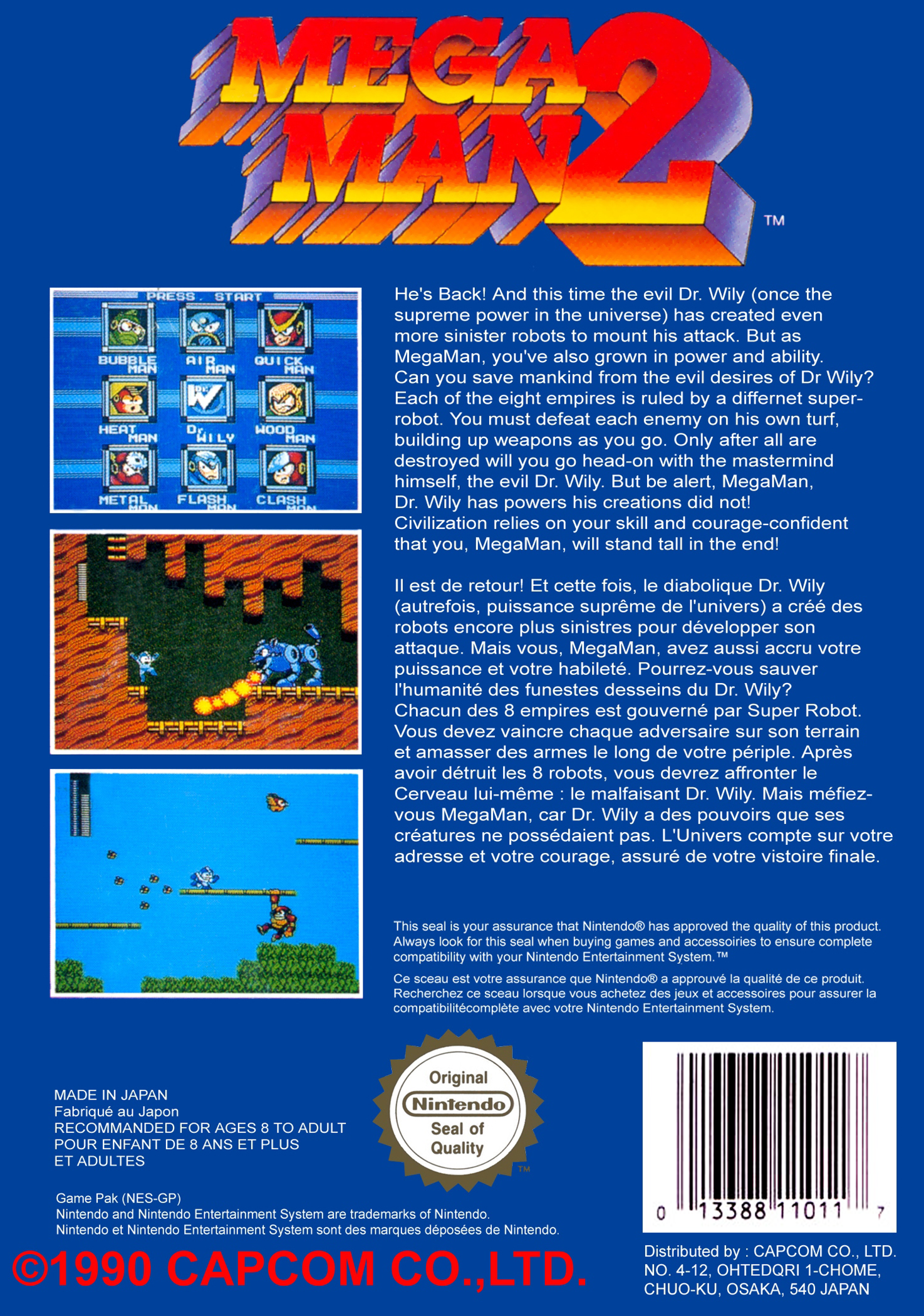 Mega Man 2 is the sequel to the NES game Mega Man. In this game, Metal Man, Air Man, Bubble Man, Quick Man, Crash Man, Flash Man, Heat Man and Wood Man are Dr. Wily's eight prize creations that have been sent to take over the world. As Mega Man defeats these bosses, he can steal their powers and use them for himself. Each Robot Master is weak against another's weapon, and through experimentation, Mega Man can gain the upper hand by using the weapon they're vulnerable against.