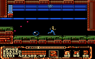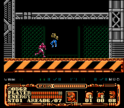 Power Blade 2 has six stages which involve you running through the level, while killing off enemies and avoiding hazards. At the start, you can choose which stage to start at, but unlike Power Blade, once you have chosen a stage, you can't exit and choose another one until you have completed the current one first. Nearly each stage involves you using your wits, as you dodge spikes, jumping towards the top of the screen to avoid fire, and getting fans to lift you onto platforms. You can also slide your way through tight spots, as long as you slide in the right place.