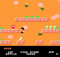 The arcade release soundtrack sounded very similar to the song "(Somewhere) Over The Rainbow" from the TV musical "The Wizard Of Oz". This soundtrack made it into the Japanese versions of the Famicon and Mega Drive releases as well as the European and US releases on Commodore 64, Amiga, Atari ST, ZX Spectrum and Amstrad.