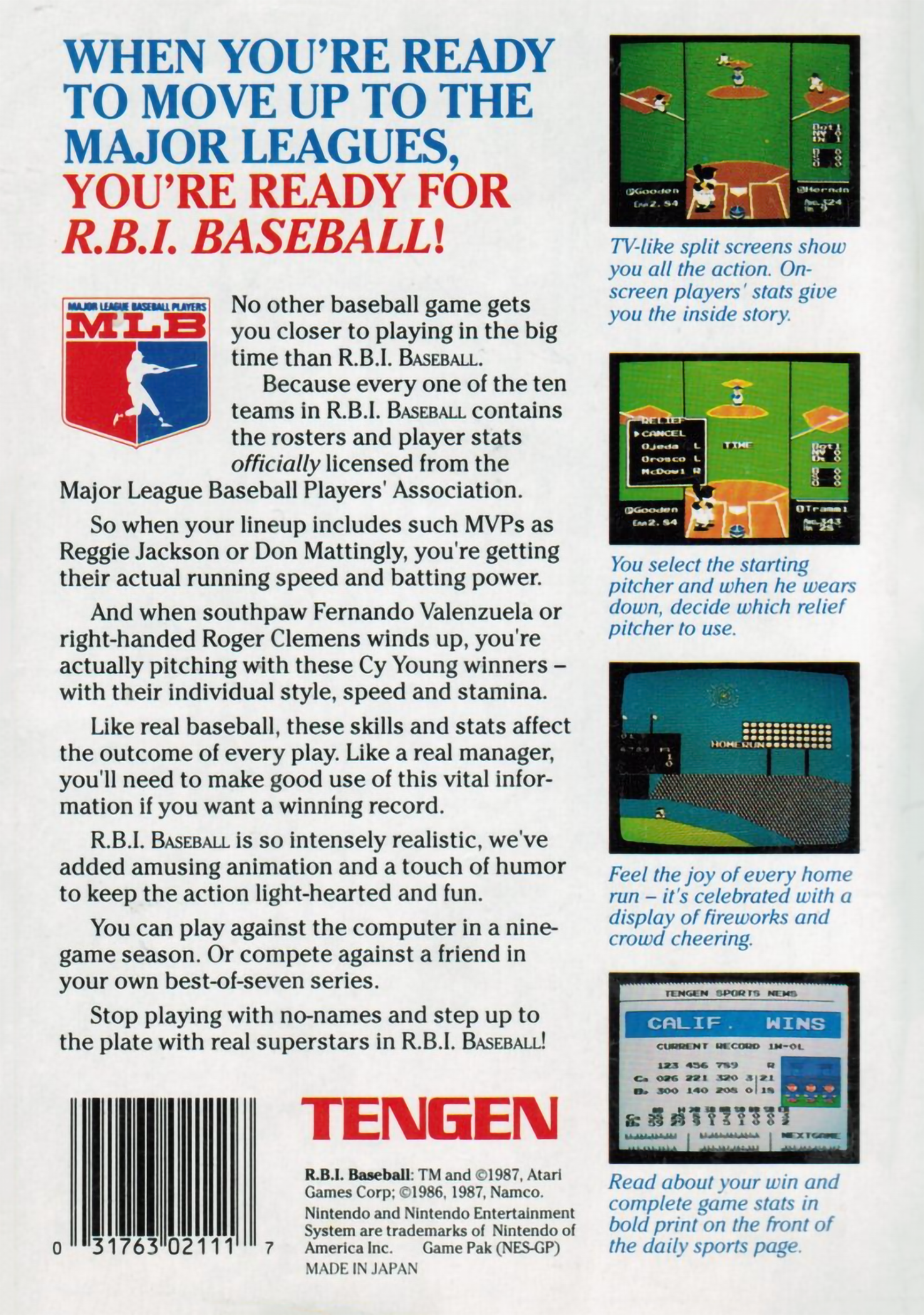 | __long_description | R.B.I. Baseball was originally released in Japan under the name Pro Yakyuu Family Stadium on December 10, 1986, as part of the Family Stadium franchise. The US version, a port by Atari Games (under the Tengen label) released on January 5, 1988, features a license from the Major League Baseball Players' Association, allowing it to have real baseball players on the roster. However, due to a lack of the core MLB license, the game doesn't contain real teams, referring to all of them by city name only.
