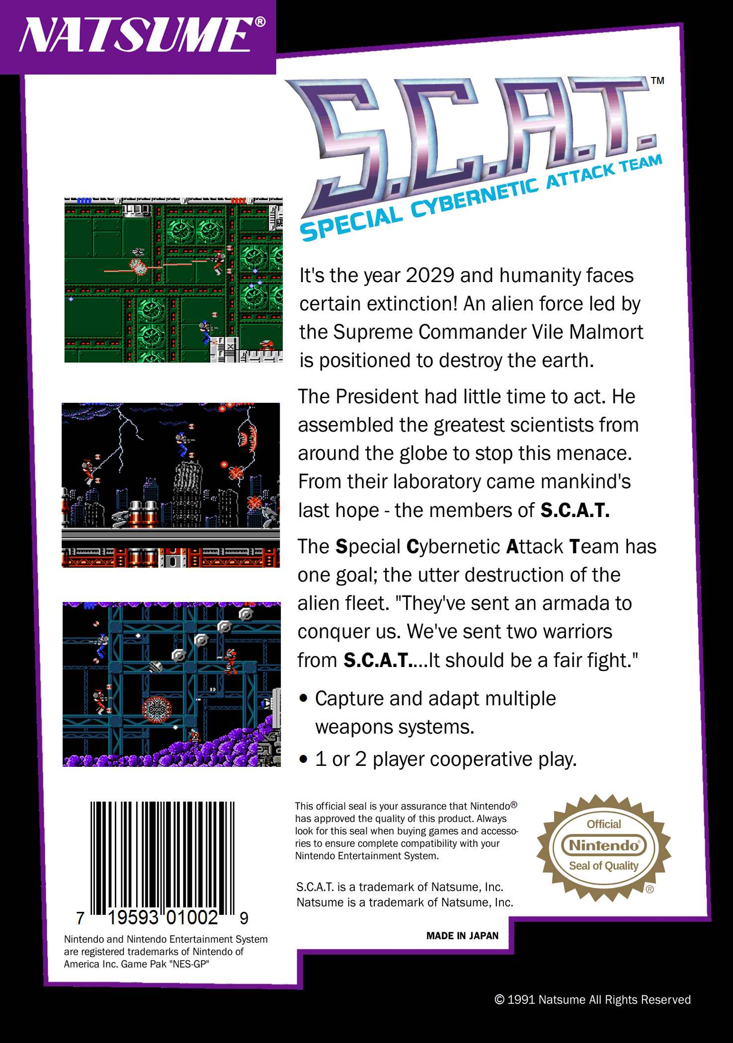 The year is 2029 and an alien invasion, led by Supreme Commander Vile Malmort, threatens the earth. He has destroyed the city of New York and built a device known as an "Astrotube", which connects the ruins of the city with his alien space station. If this invasion does not stop, humanity will surely be doomed! A duo of cyborg soldiers have been assigned to combat the invading forces, known as "S.C.A.T." The fate of mankind rests on the success of their five-stage mission.