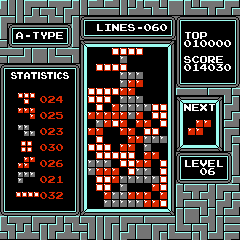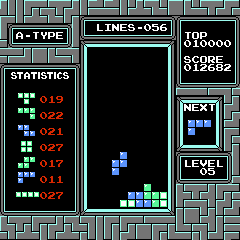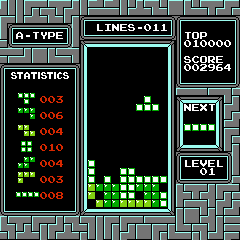 This version of Tetris is one of many conversions of the famous block-stacking game, as well as the best-known (but not the only) version on Nintendo's first home console. The goal is to place pieces made up of four tiles in a ten-by-twenty well, organizing them into complete rows, which disappear. As rows are cleared, the pace of the game increases, and the game ends if the stack reaches the top of the well.