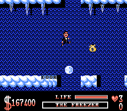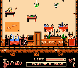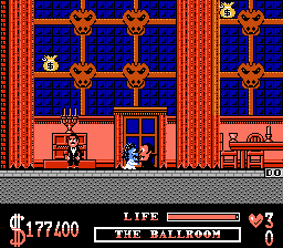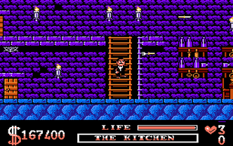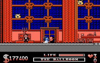 The Addams Family is a side-scrolling platformer based on the movie of the same name. The player takes the role of Gomez who searches for his missing family members. To find them he has to explore six different parts of the mansion, e.g. the woods, which are basic platform levels: the player moves from left to right while jumping a lot and avoiding enemies. Some of them can be dispatched of by a jump on their heads.