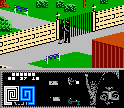 Enemies, armed with fists and various ninja weapons, wander around the levels. The ninja must fight them either bare-handed or with the weaponry he finds along the way; in either case, he has a number of blows and attacks at his disposal, as well as the ability to block. There's a special weapon, shuriken, which are thrown in a straight line rather than used for melee combat; if they strike an enemy, they'll instantly kill or at least heavily damage him.