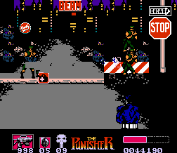 The NES version of The Punisher is an on-rails shooter tracking behind Frank Castle as he trades fire with the gangs of some of his classic enemies. Aside from being one of the few NES rail shooters, the game features an uncommon amount of destructible items in its levels. You also have the ability to move Frank to the left or right of the screen to dodge incoming fire, or to hold down the fire button to lock him in place and move the aiming cursor.