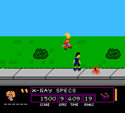 On each of the five levels, Bart must collect (or get rid of) the ingredients that the Space Mutants are planning to use to build their machine, such as purple objects or balloons. He also has to collect enough "proof" of the aliens existence (brown coins left behind when they are jumped on), so his family members will help him when he meets a boss (characters such as Nelson and Sideshow Bob). This won't be easy since the Space Mutants are "using" human bodies as disguise. In order to discover who are the real Space Mutants, Bart must use his X-ray Specs.